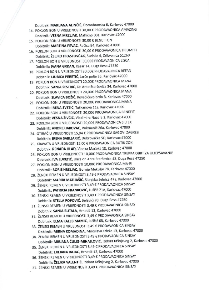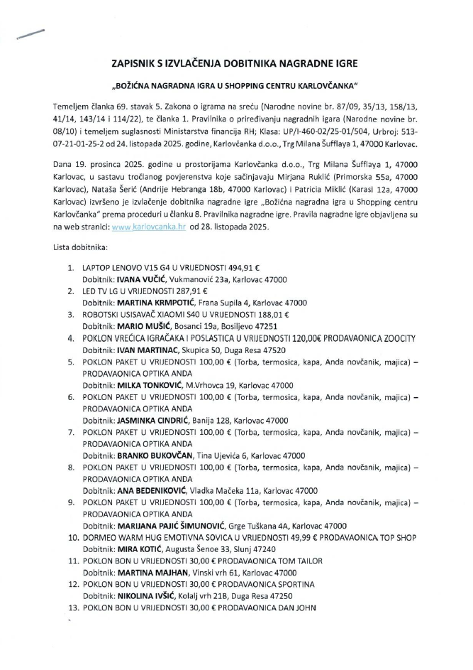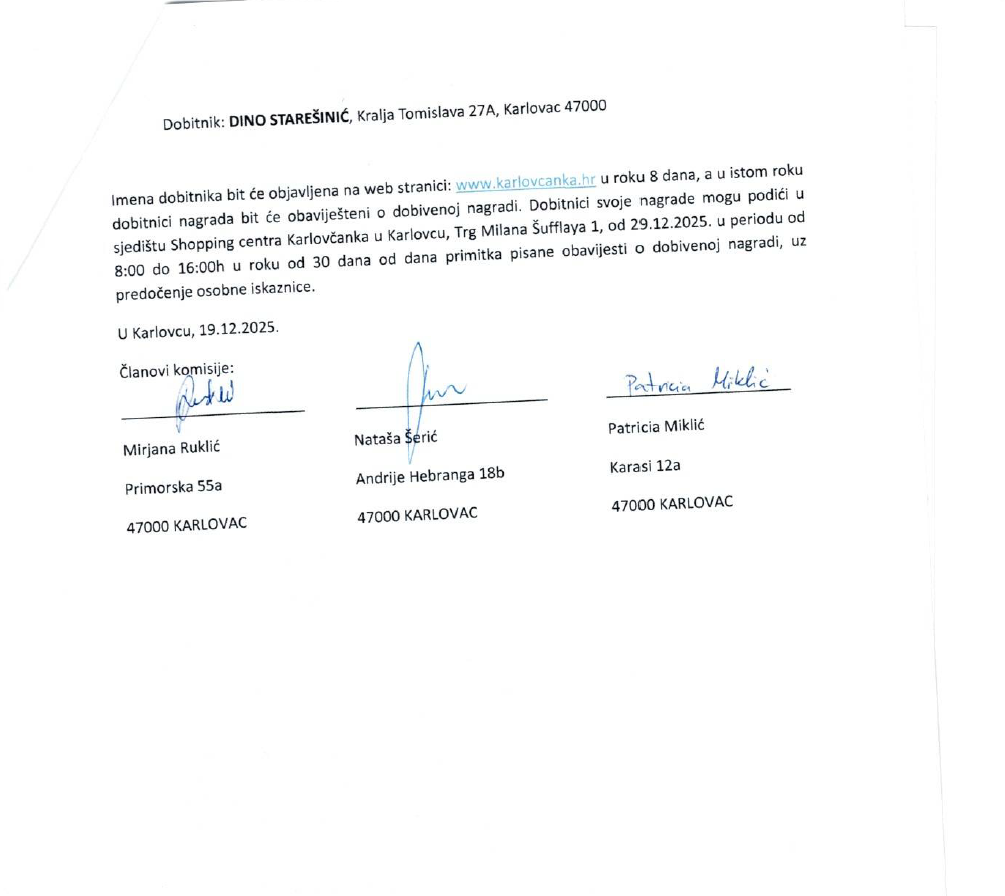 Dana 19. prosinca 2025. godine u 17:00h izvršeno je izvlačenje dobitnika nagradne igre „Božićna nagradna igra u Shopping centru Karlovčanka“.