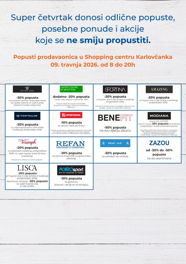 ✨ Otkrij koje te sve pogodnosti i popusti očekuju 9.4.2026. u Shopping centru Karlovčanka.