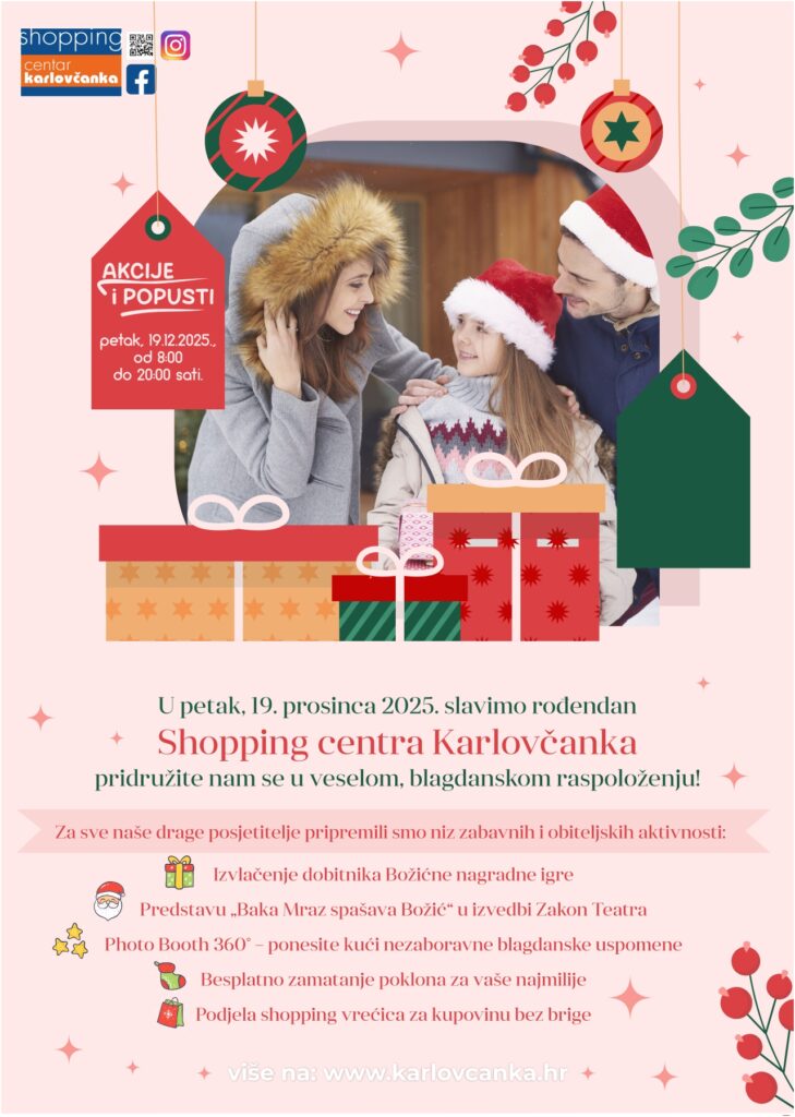 U petak, 19. prosinca 2025., Shopping centar Karlovčanka slavi svoj rođendan i tim povodom pozivamo vas na cjelodnevno blagdansko druženje ispunjeno odličnom atmosferom, posebnim pogodnostima i programom za sve generacije. Od 8:00 do 20:00 sati uživajte u kombinaciji rođendanskog slavlja i božićnog ugođaja koji će ispuniti cijeli centar.