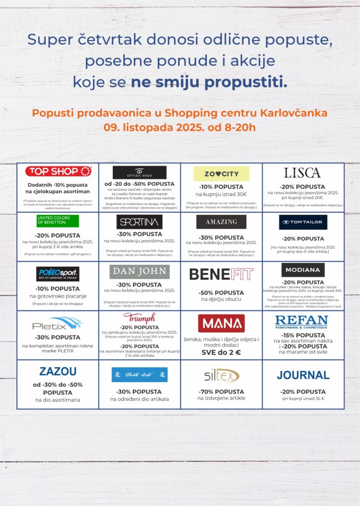 Spremni za pravi jesenski šoping? Ne zaboravi da je sutra još jedan tradicijski Super četvrtak u SC Karlovčanka – a evo i popusta koji te čekaju ovog 09. listopada!